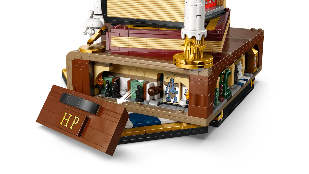 Ana yapının çevresinde, ilk filmden akılda kalan önemli anların minyatür canlandırmaları yer alıyor. Hogwarts Ekspresi, Felsefe Taşı’na giden yolda Harry’nin karşılaştığı beş sınav ve çeşitli ikonik objeler bunlar arasında. Albus Dumbledore’un yer aldığı bir Çikolatalı Kurbağa kartı, Felsefe Taşı ve iki Galleon gibi küçük ama anlamlı detaylar da sete dahil. Tek bir büyük sahne yerine, set adeta anılardan oluşan bir koleksiyon hissi veriyor.